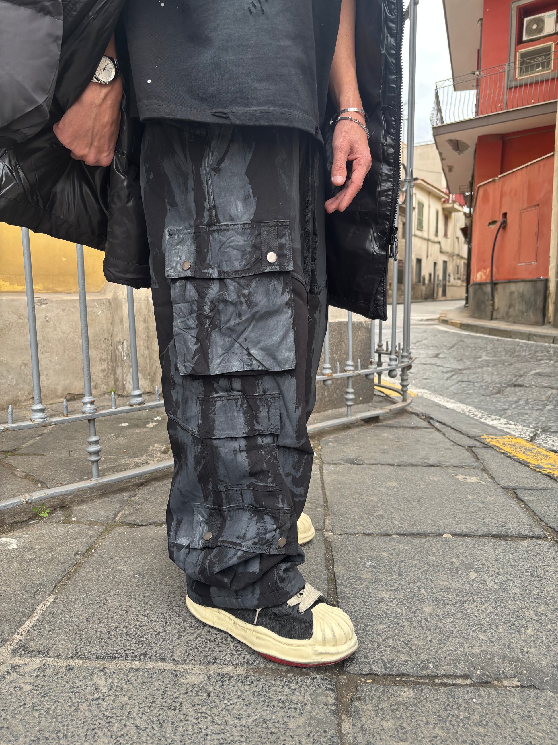 Pantalone cargo sfumato con default painting